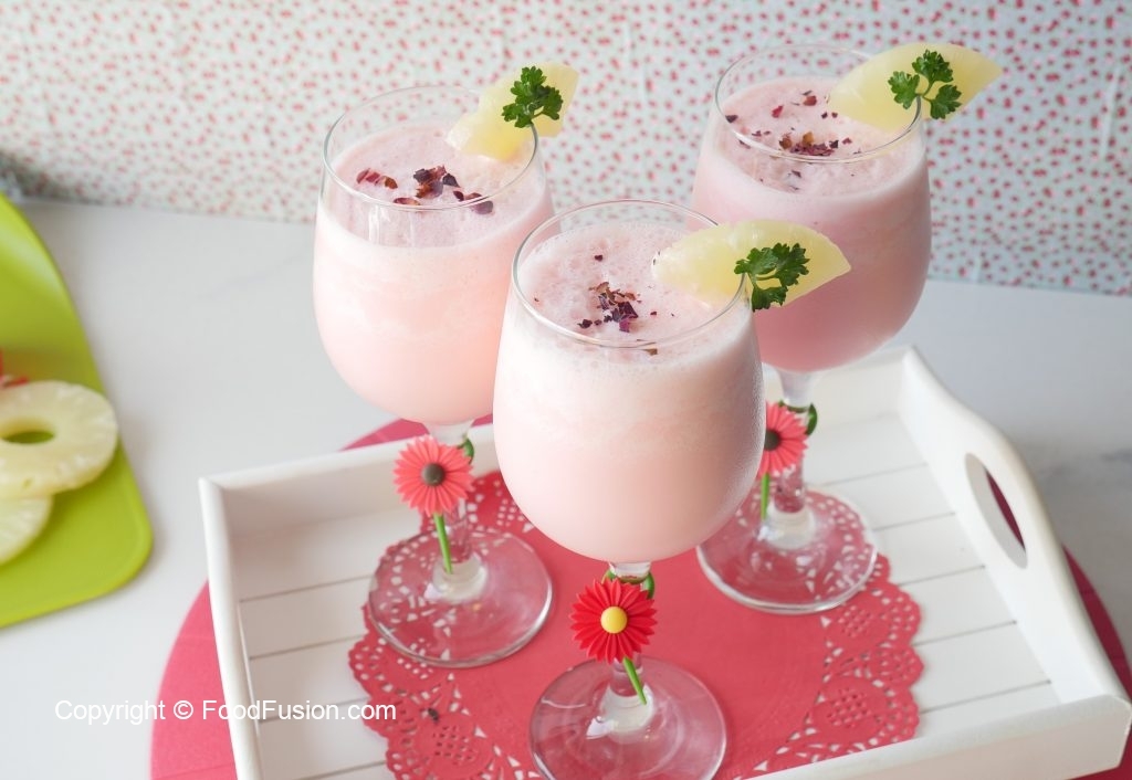 Blender jar mein pineapple chunks,pineapple syrup,doodh,qarshi jam-e-shirin aur coconut milk powder dal ker ache tarhan blend ker lein.