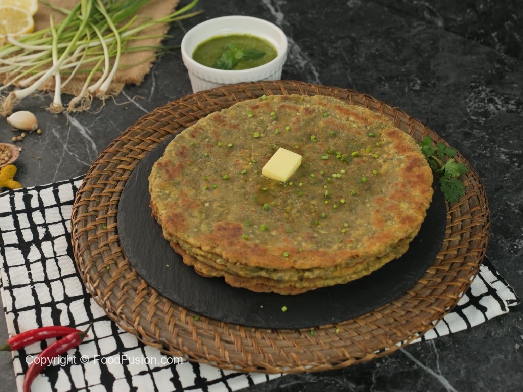 Hara lehsan aur makhan laga lein aur green chutney ka saath serve karein.