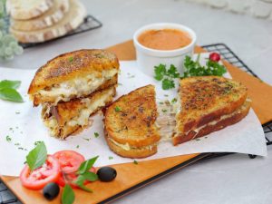 -Ek bread slice per cheddar cheese slices,mozzarella cheese,tayyar beef filling aur mozzarella cheese dal ker dosra bread slice rakh dein.