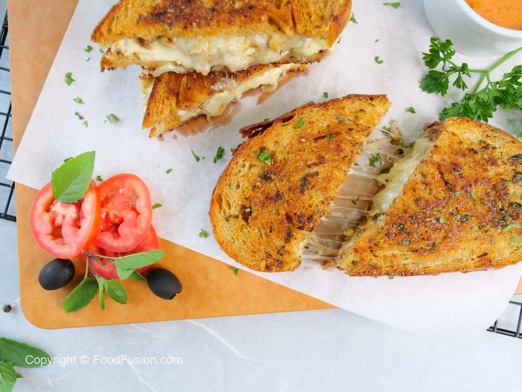 -Take two sourdough bread slices & apply prepared herbed butter on both sides of them.