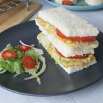 On bread slices,add & spread chicken tikka spread,iceburg,tomato slices and top with another bread slice,cut into pieces & serve!