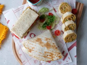 Cut one side of tortilla,add & spread chicken tikka spread,cheese slice,cucumber,tomato, potato fries and drizzle tomato ketchup,fold and grill for a minute & serve!