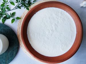 Add yogurt,cover & leave clay pot undisturbed in a warm place for 8-10 hours or overnight.