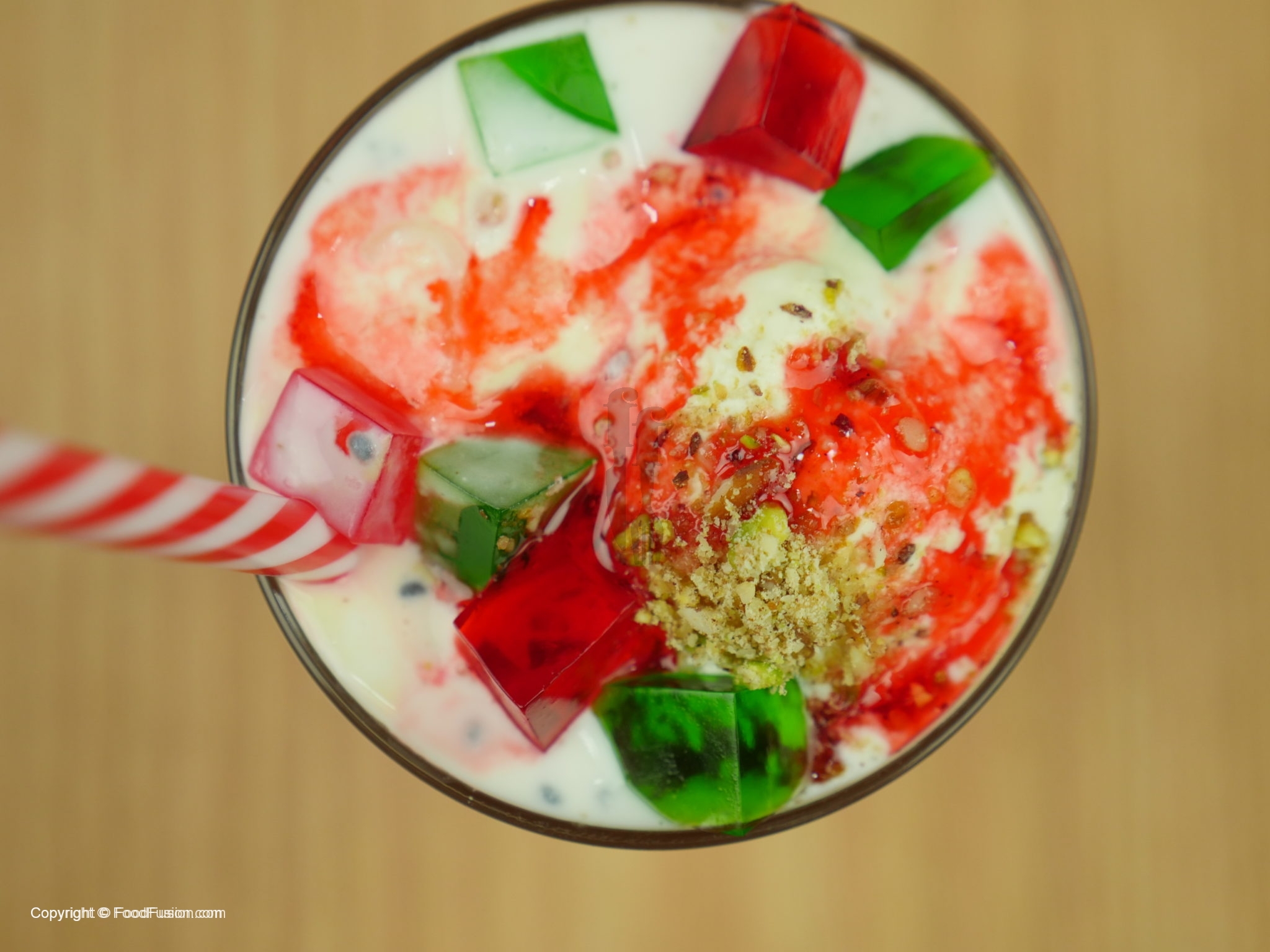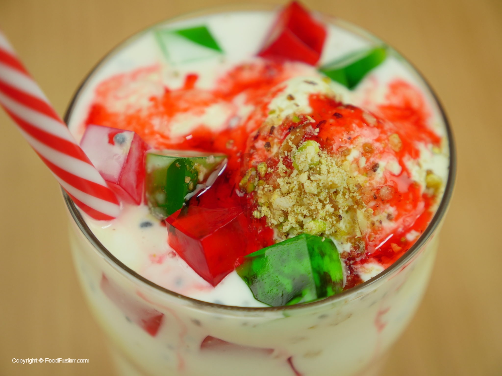 Glass mein lal sharbat,corn flour ki seviyan,tukh malanga,green jelley,red jelly,mix dry fruits,rabri (thickened milk),vanilla ice cream,red jelly,green jelly,mix dry fruits aur lal sharbat dal dein.
