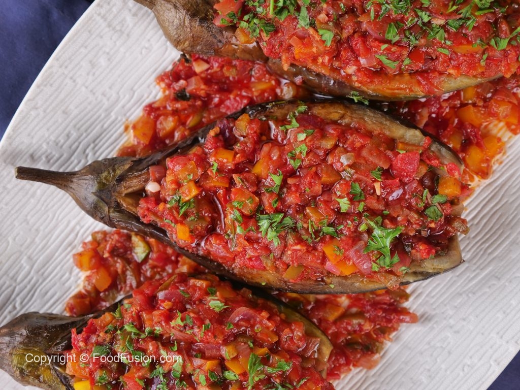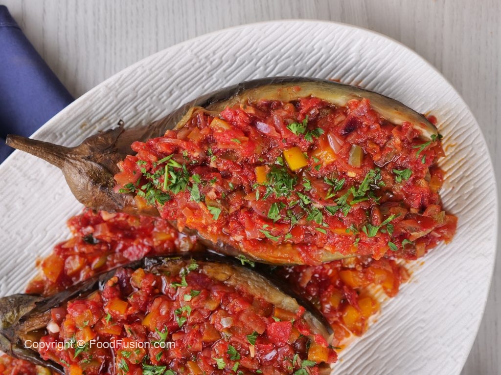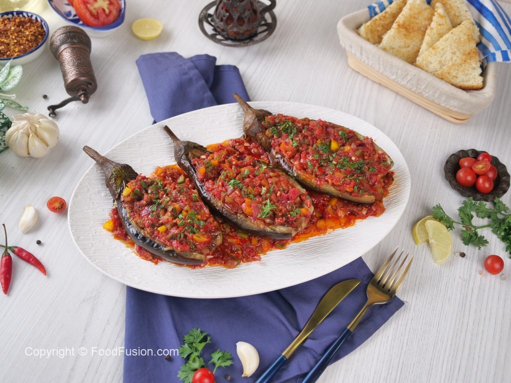 Turkish delight on a plate—tender roasted eggplant brimming with a savory filling of tomatoes, onions, and fragrant herbs. This timeless Turkish dish brings vibrant flavors right to your table. #happycookingtoyou #foodfusion #araywahh