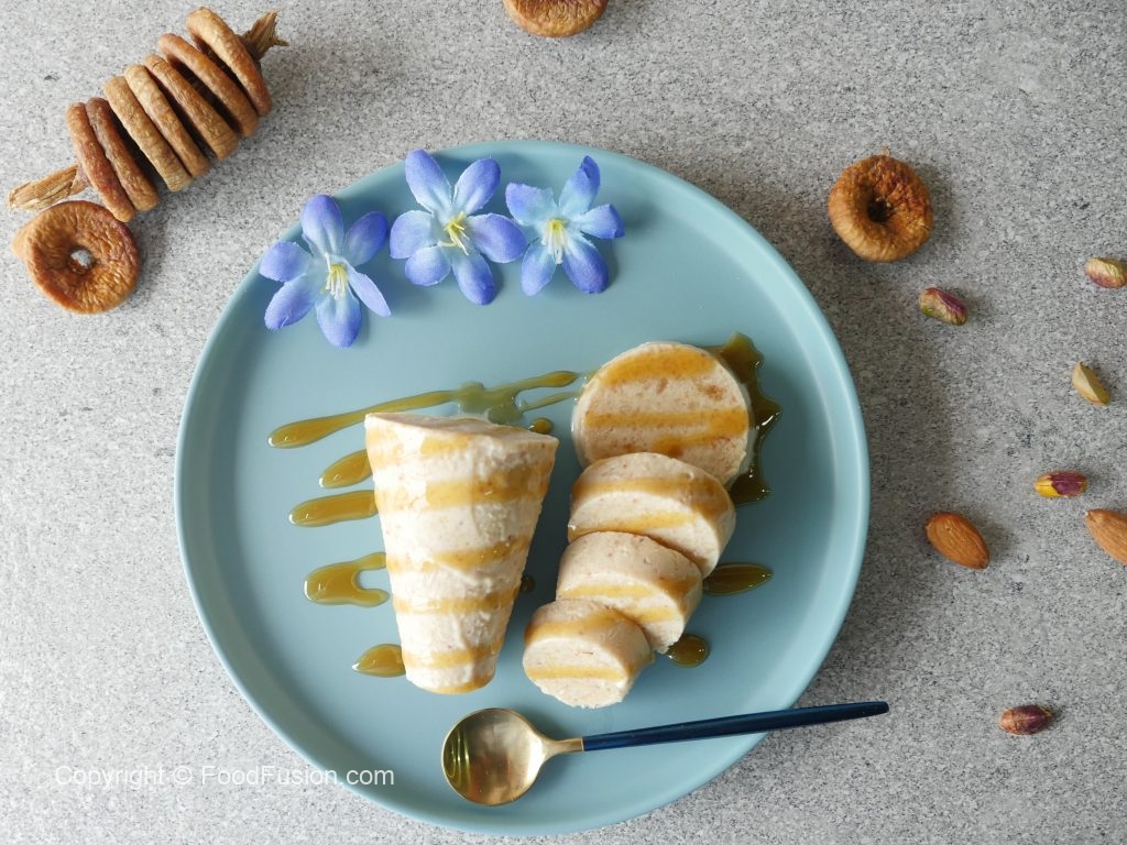 Drizzle caramel syrup and Fig kulfi is ready to serve.