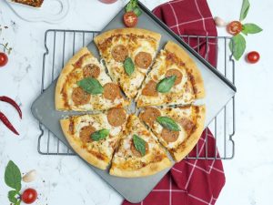 -Ab tayyar red sauce dal ker pheela lein,cheddar cheese,mozzarella cheese & chicken pepperoni dal dein.