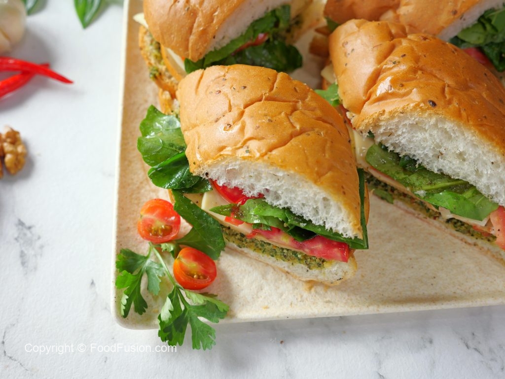 -Add & spread prepared pesto,mortadella slices,cheese slices,tomato slices,rocket leaves,olive oil,pink salt,black pepper powder & cover with top.