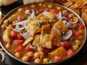 -On a serving plate,add khathiawari cholay,prepared hari chutney,tomato,chaat masala,red chilli crushed,onion,papri,fresh coriander & serve with pav buns!