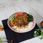 -In a serving bowl,add cooked rice,beef bulgogi,steamed spinach,stir fried shiitaki mushrooms,carrots, cucumber & kimchi.