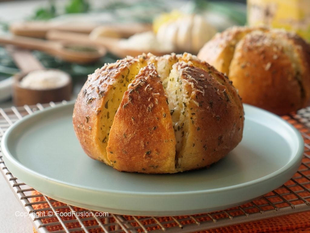 After the bread has been cut,pipe a rope of cream cheese filling in between each wedge and dip the entire bread into prepared garlic butter mixture.