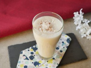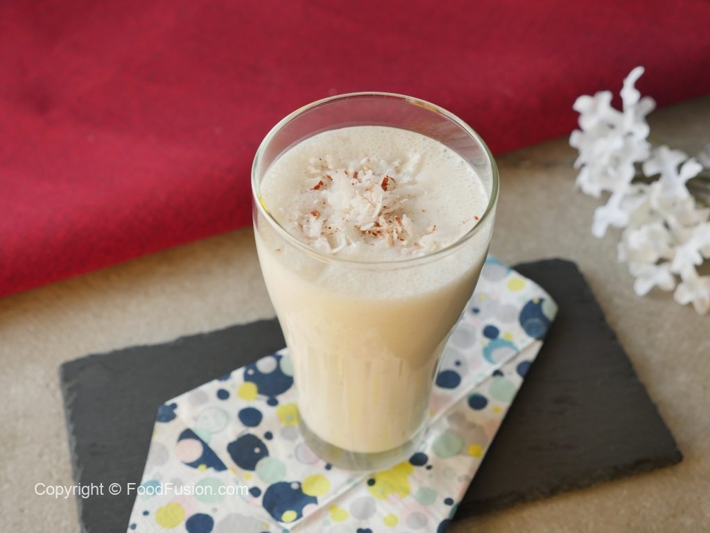 In grinder,add yogurt,coconut milk,instant oats,honey,ice cubes and blend until well combined.