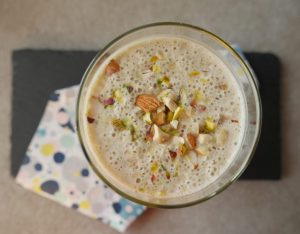 In grinder,add yogurt,ground nuts,dates (deseeded),raisins,salt,milk,ice cubes,honey and blend until well combined.