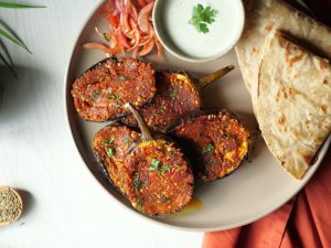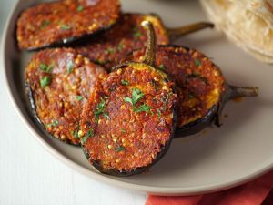 -Cut eggplant in slices vertically,make diagonal cuts on it to create diamond shape grid,apply prepared spice mix on both sides & rub gently.