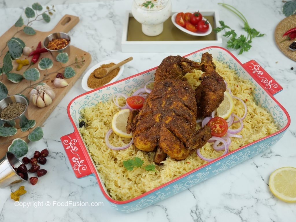 -Chulha bund ker dein aur whole chicken per tayyar spice mix chirak dein.