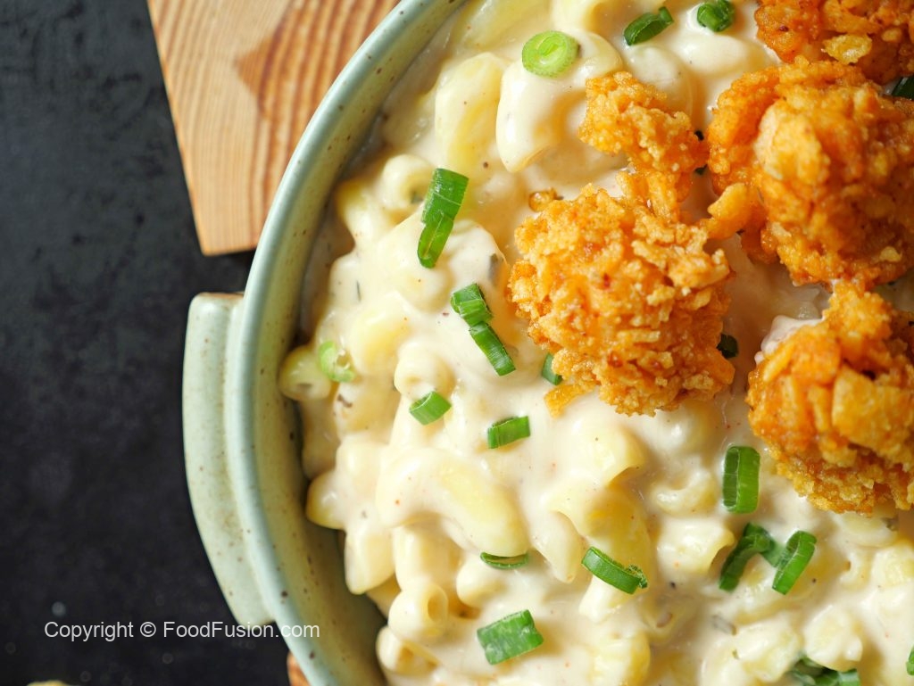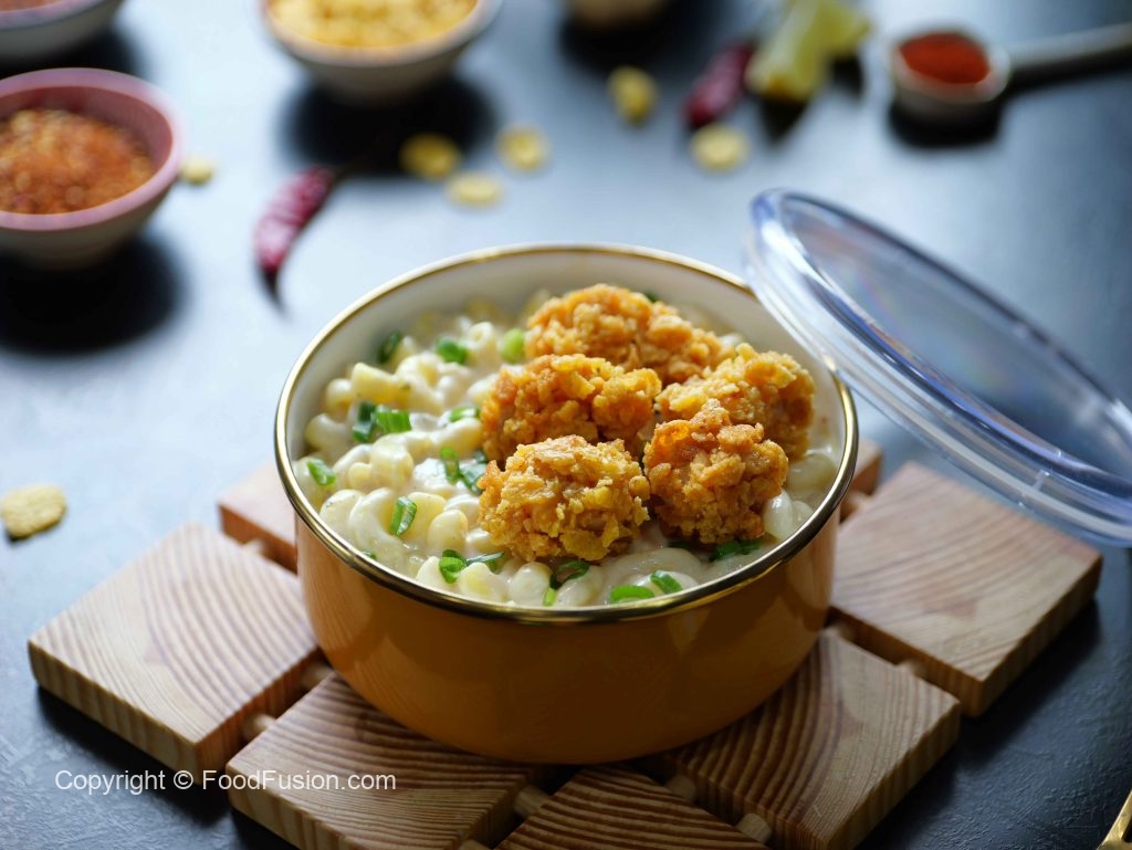 Mac & Cheese with Popcorn Chicken — a lunchbox favorite and comfort food classic! Creamy, cheesy pasta paired with crispy chicken bites makes every bite a treat. Perfect for school, work, or a cozy meal at home! #happycookingtoyou #foodfusion #araywahh #lunchboxideas