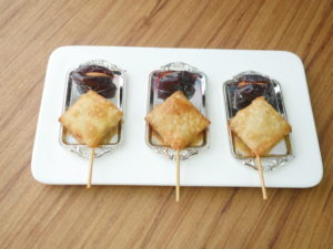Take samosa sheet and cut into four equal parts/strips,place one samosa patti/strip horizontally,apply all-purpose flour paste,place skewer/stick then place second samosa patti vertically over first one,it will make plus (+) sign.