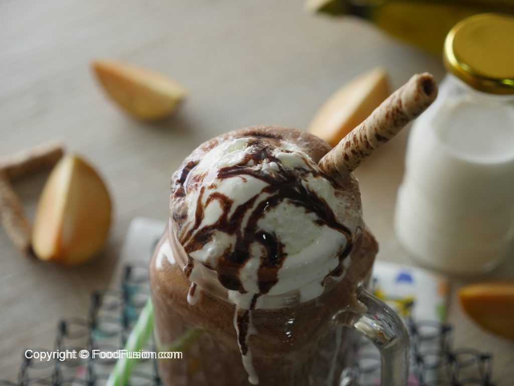 Blender mein banana,chikoo,cheeni,cocoa powder,vanilla ice cream,ice cubes aur doodh dal ker ache tarhan blend ker lein.