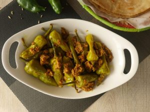 Slit green chilies with the help of the knife and stuffed with prepared spice mix.