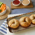 Teen chotay dough lein aur tayyar chicken filling,tayyar aloo filling aur tayyar mozzarella cheese dal ker edges per pani laga lein aur properly seal ker lein.