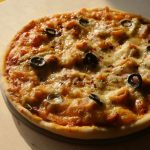 Add and spread pizza sauce, cheddar cheese, chicken chunks, capsicum, onion, red chilli crushed, mozzarella cheese, olives & dried oregano. (makes 1 small size pizza)