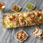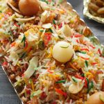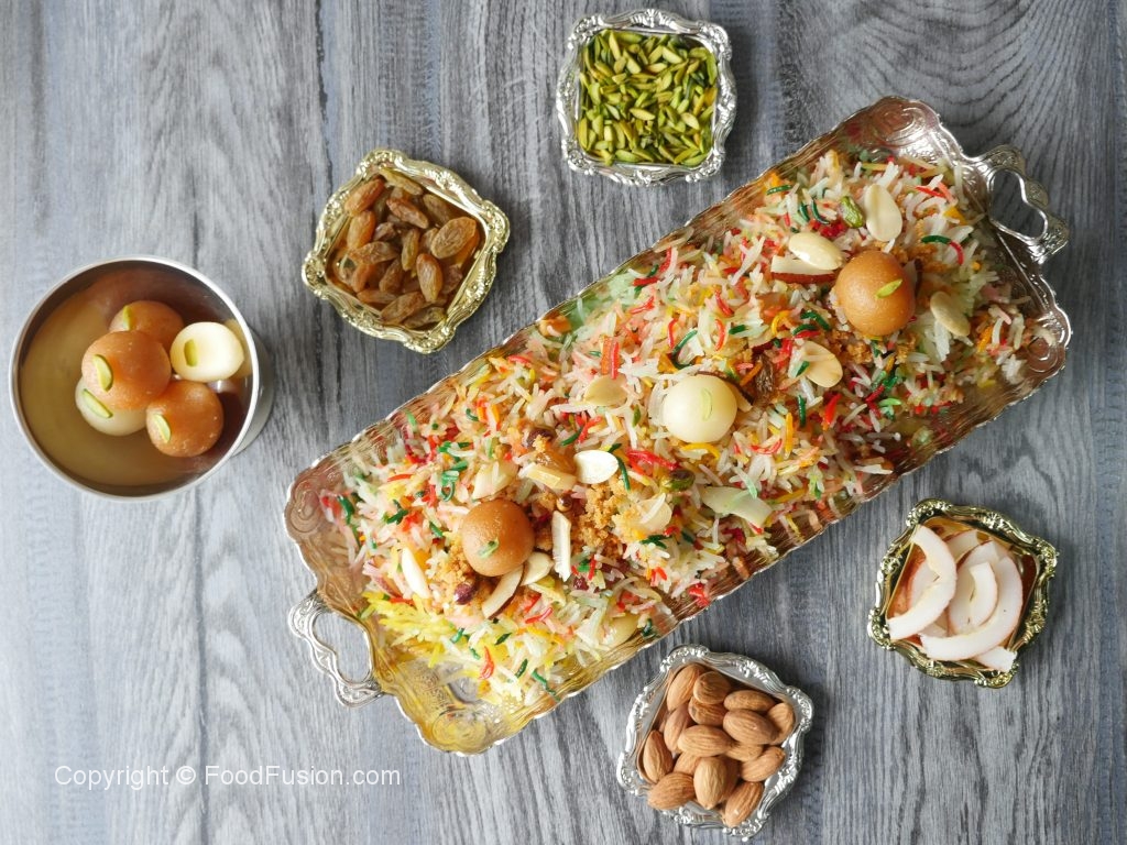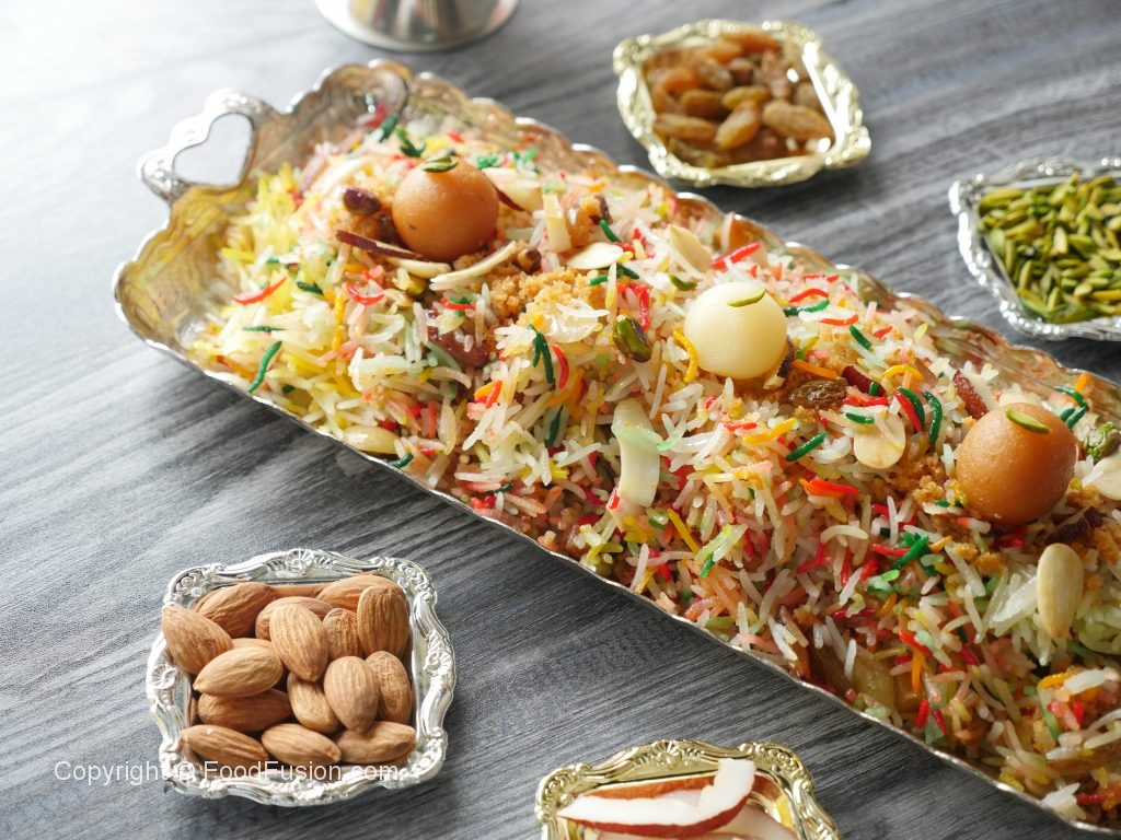 Fried khoya,green colored chawal,red colored chawal aur yellow colored chawal dal dein.