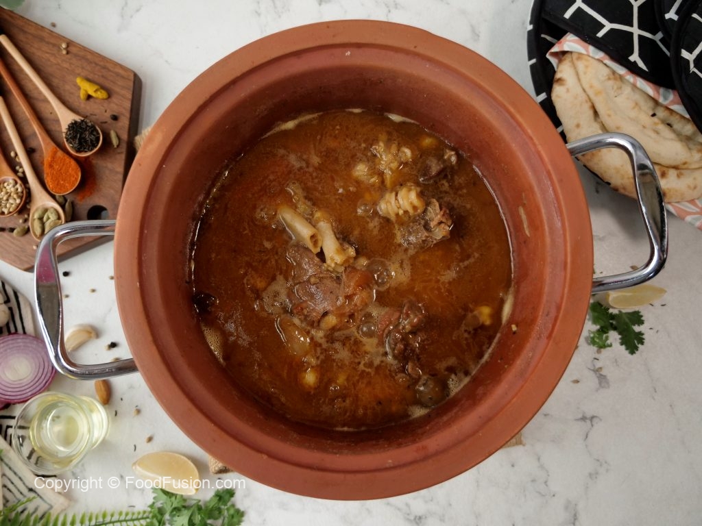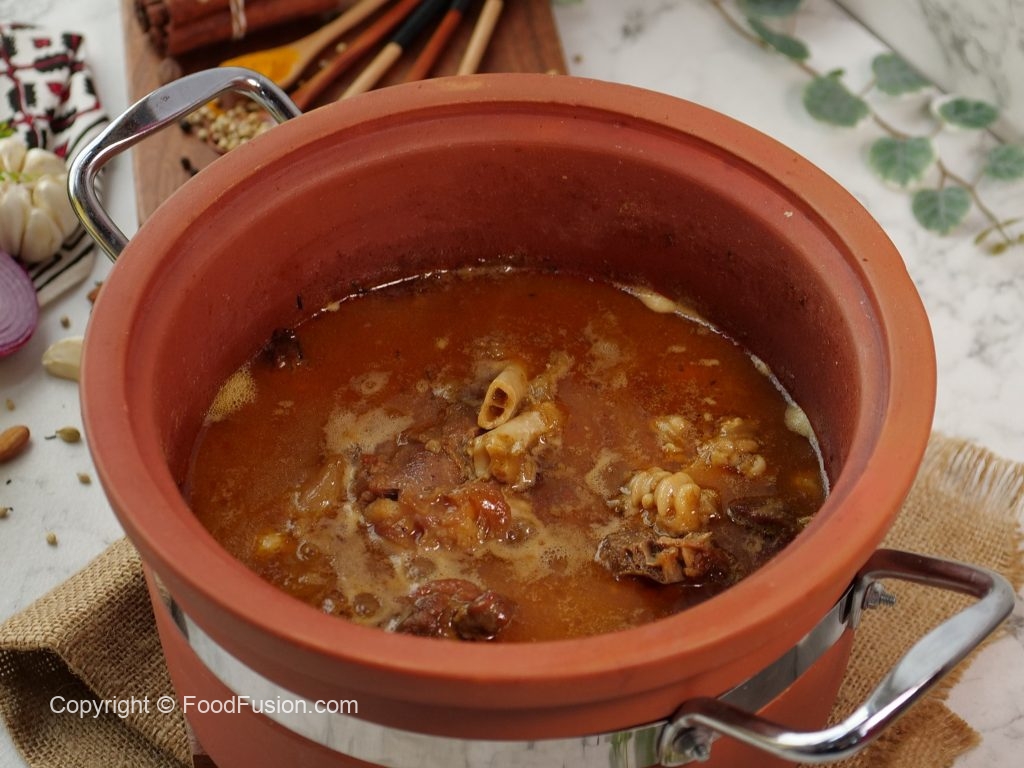 Mutton paya mein namak,badi elaichi,laung,sabut kali mirch,darchini,tez patta,adrak lehsan paste ayr garam pani dal ker ache tarhan mix karein aur ubal anay ka bad dhak dein aur halki ancch per gul janay tak paka lein (2-3 hours).