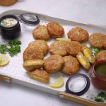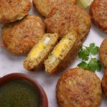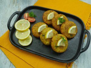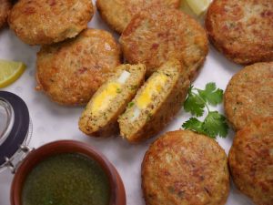 -In frying pan,heat cooking oil,dip patty into whisked egg & fry on medium flame until golden (makes 14).