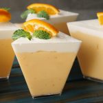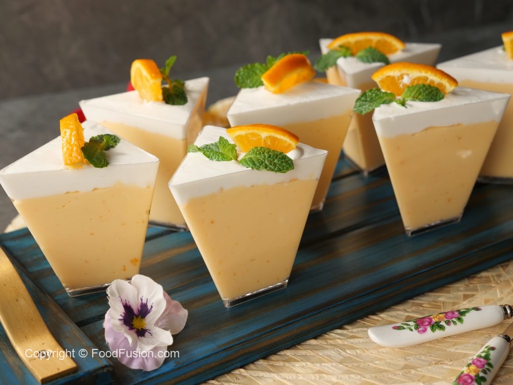 In serving cups,add a layer of orange mousse,whipped cream and scrape excess cream.