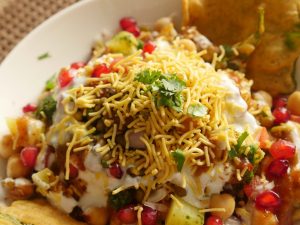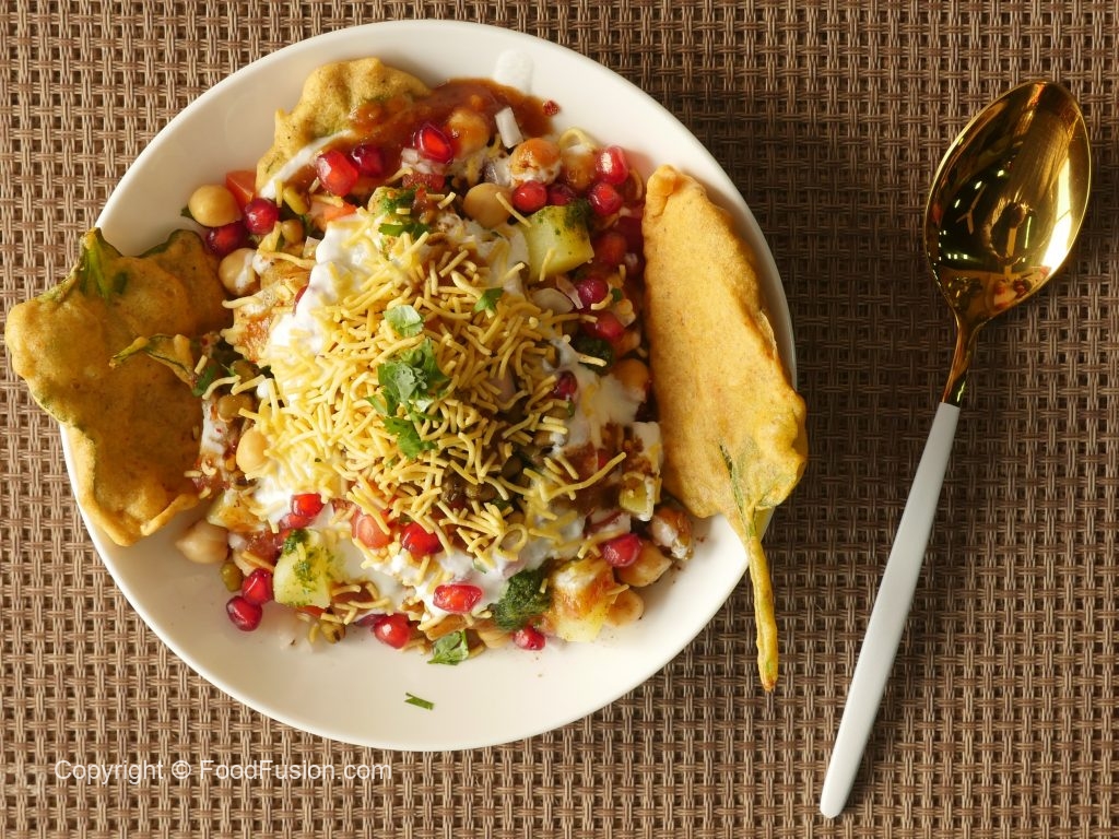 Platter mein palak pakora,hari mong daal,chanay,aloo,pyaz,tamatar,dahi,tayyar hari chutney,tayyar khatti chutney,nimco sev,anaar,lal mirch crushed,chaat masala aur hara dhania dal ker serve karein.