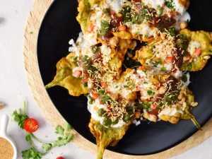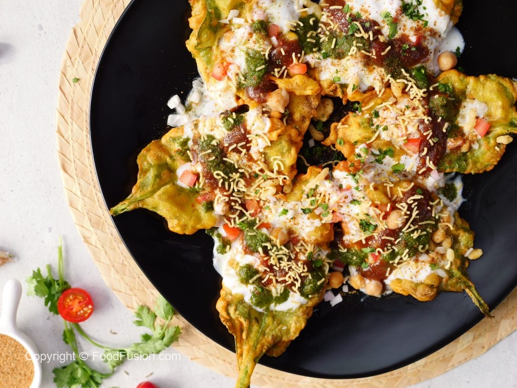 -Assemble fried palak patta on a platter,add chickpeas,bareek boondi,tomato,onion,yogurt,khatti meethi chutney,green chutney,sprinkle chaat masala,nimco sev & fresh coriander & serve!