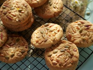 -Chota doigh lein (50g) aur ball bana ker gently press karein aur cookie ki shape bana lein phir cookie ki ek side ko mixed nuts ka upper press ker lein (makes 15).