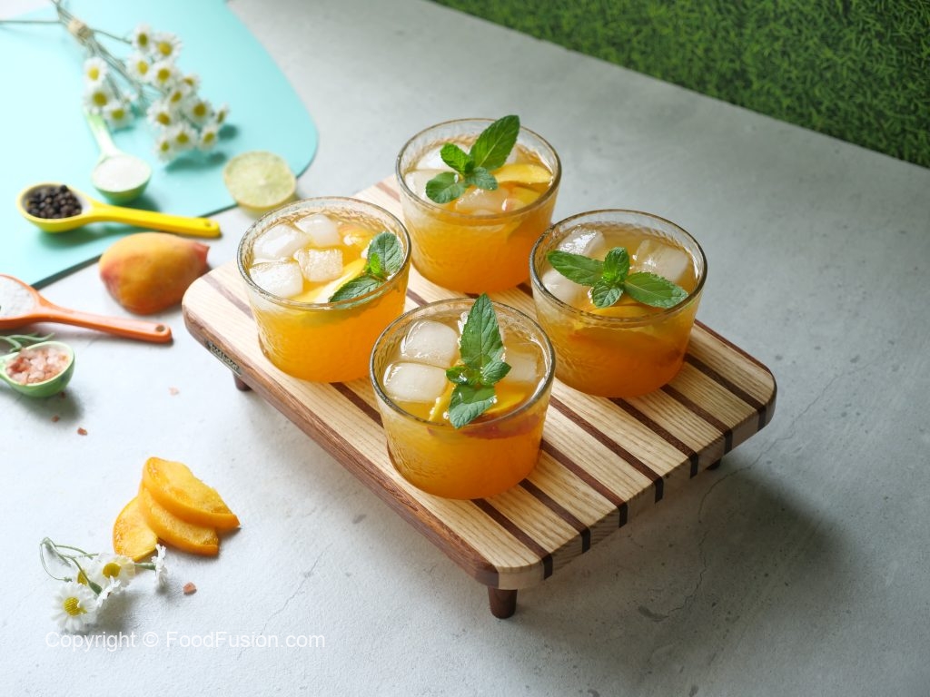 -Serving glass mein ice cubes,peach slices,tayyar peach drink aur podina dal kar serve karein!
