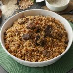 -Now add cooked meat,sprinkle reserved ground spices (1 tsp),cover with kitchen cloth & lid and cook on high flame for 2 minutes to build up steam then steam cook on low flame for 8-10 minutes.