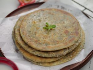 Add & spread ghee & sprinkle prepared mint spice mix.