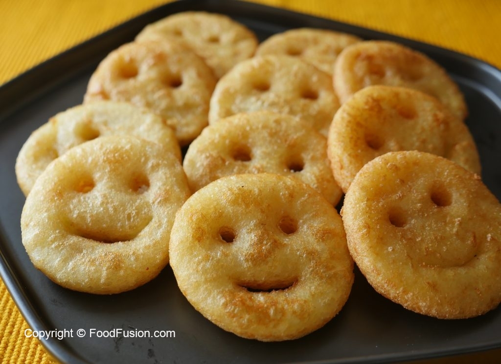 In wok,add corn oil,heat it and fry potato smileys on medium flame until golden brown.