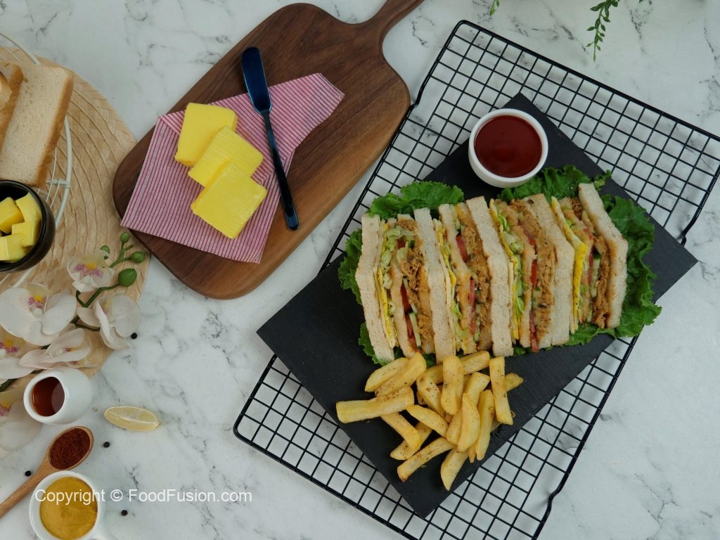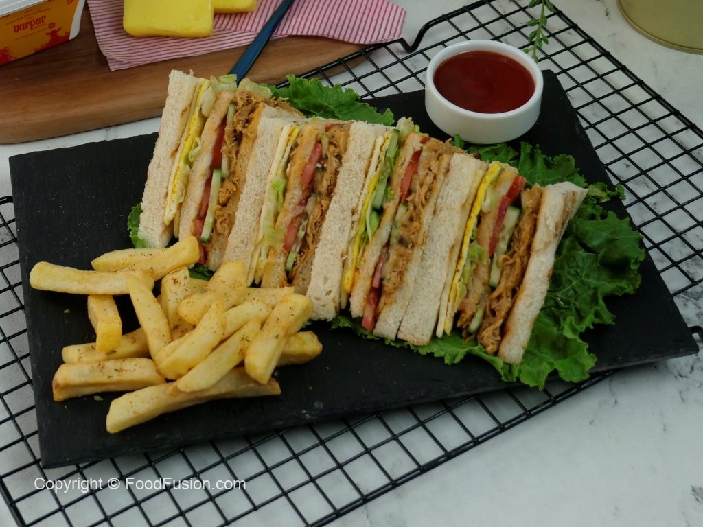 Bread slice mein pulled chicken dal ker pheela lein,kheera slices aur tamatar slices dal dein, another toasted bread slice rakh dein,tomato ketchup,ice berg,tayyar anda aur chedder cheese slice rakh ker upper sa toasted bread slice rakh dein (makes 4-5 sandwiches).