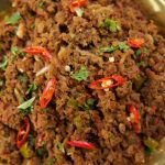 -In a wok,add beef mince,onion,tomatoes,ginger garlic paste,green chilli paste,yogurt,turmeric powder,salt,kashmiri red chilli powder,red chilli powder,garam masala powder,mix well & marinate for 15 minutes.
