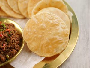 -Chota dough (60g) la ker ball bana lein,cooking oil sa grease karein aur rolling pin ki madad sa bail lein.
