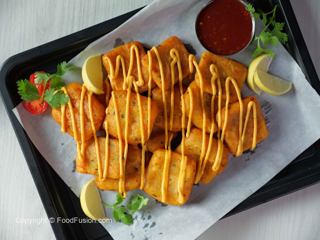 -Place rectangular mold on cling film,add & spread potato mixture & press gently then cut into square shape (30g) with the help of greased knife (makes 12).