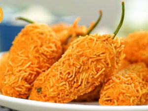 -First, dip samosa in whisked eggs, then coat evenly in bread crumbs.