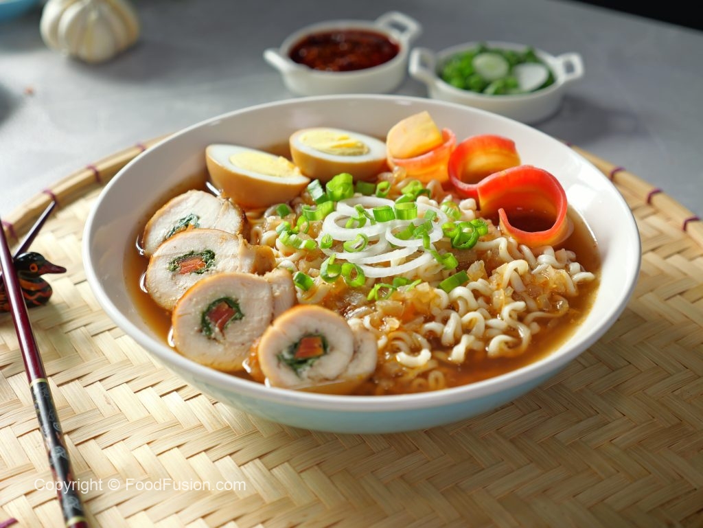 -Serving bowl mein ramen noodles, carrot, chicken slices, soy sauce eggs, reserved chicken broth, spring onion aur spring onion leaves dal kar serve karein!