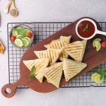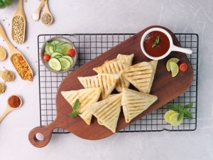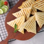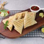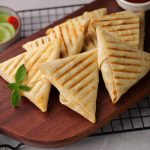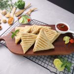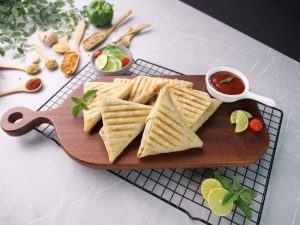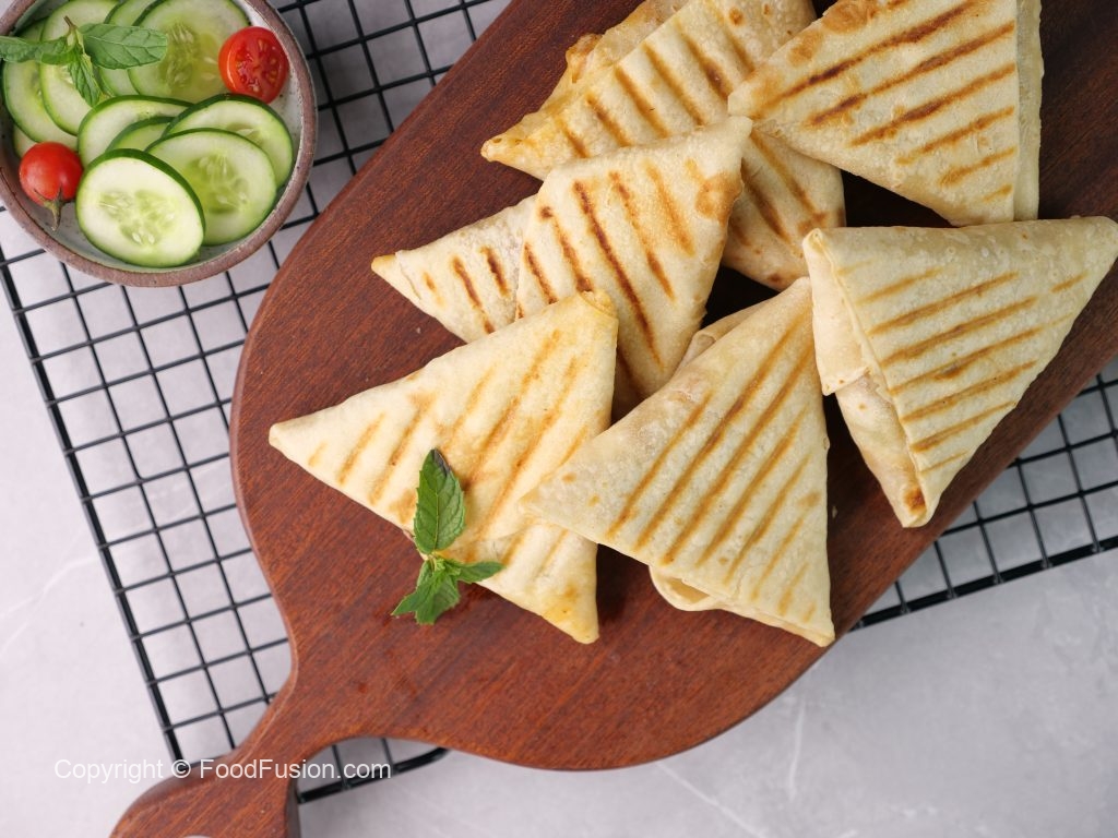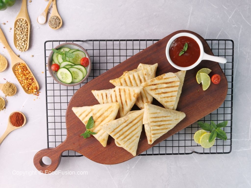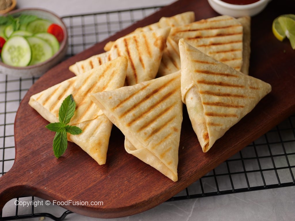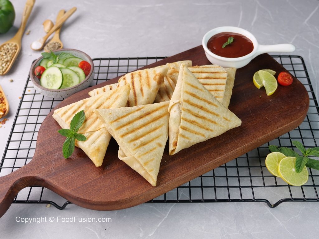 -Grease preheated panini press with cooking oil,place roti triangles & grill at 180C for 4-5 minutes (use panini press or frying pan).