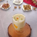 -In a serving glass, add crushed ice, yellow jelly, prepared pista badam doodh, garnish with pistachios, almond & serve!