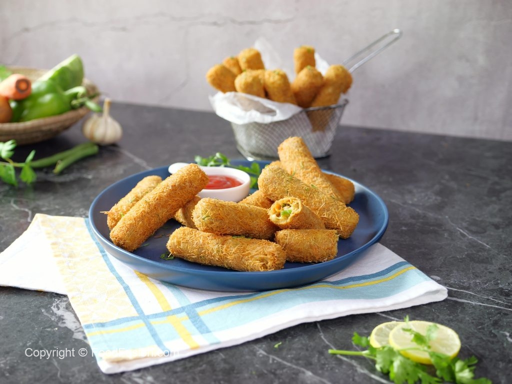 -Grease hands with cooking oil,take 40g of mixture & make finger shape kabab then coat with all-purpose flour,dip in whisked egg & coat with vermicelli (make 24-25).