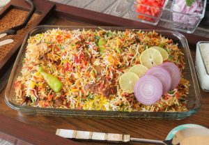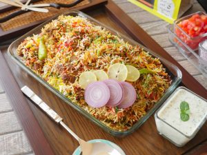 Spread dissolved red food color,green food color,orange food color & yellow food color,mint leaves, fresh coriander,fried onion,cover & steam cook on low flame for 18-20 minutes.