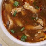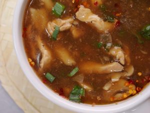 -In serving bowl,add red chilli crushed,soy sauce,sesame oil,soup,green onion leaves & serve!