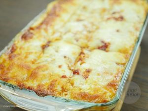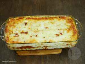 Once golden crust of mozzarella appears on the top then turn off the oven. Put baking dish aside and cut lasagna into square shape and now it’s ready to serve.