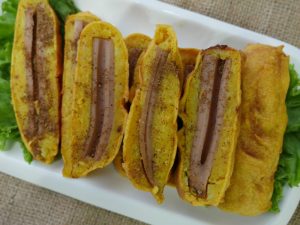 Now dip potato coated lotus root in gram flour batter and coat well.