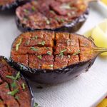 -Cut eggplant into half,make vertically & horizontally cuts & sprinkle prepared spice mix (reserve for later use).